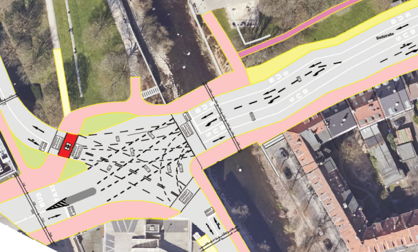 Nach Abwägung der Vor- und Nachteile der geprüften ÖPNV- sowie Radwegeführung schlägt die Verwaltung vor im Bereich des Brückenbauwerks auf die Einrichtung von ÖPNV Spuren zu verzichten und stattdessen Radspuren anzulegen. Eine Realisierung von ÖPNV-Spuren im nördlichen Anschluss des Brückenbauwerks, sowohl in Fahrtrichtung Landgericht als auch vom Landgericht kommend, sollte zu einem späteren Zeitpunkt weiterverfolgt werden. Die derzeit bereits gute Situation für den Fußverkehr bleibt bestehen.