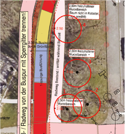 Die Behelfsbrücke selbst kann ebenfalls nicht breiter gestaltet und somit für eine zweispurige Befahrbarkeit (unabhängig der Nutzung nur durch ÖPNV bzw. weitere Kraftfahrzeuge) nutzbar gemacht werden. Dies liegt vor allem an den örtlichen Rahmenbedingungen (v.a. Spielplatz, Haltestelle Emilienplatz, Baumbestand). Die vorhandenen Bäume sind aufgrund ihrer Größe und Art als besonders schützenswert anzusehen, weshalb eine Schädigung oder gar eine Rodung der Bäume ausgeschlossen wird. Dementsprechend muss die Lage der Brücke und der sich anschließenden provisorischen Wegeführung mindestens 2,50 m von den Baumstämmen entfernt liegen. Direkt betroffen sind hier vier Bäume (s. Abb. 5). Aufgrund der Restriktionen und der untersuchten Schleppkurven ist daher nur eine einspurige Behelfsbrücke umsetzbar.