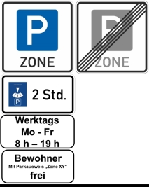 In der ersten neuen Parkzone (Zone F) wurden dennoch zur Verdeutlichung überall dort, wo Verkehrszeichen den Beginn einer Gehwegparkregelung markieren, die der Parkzonenregelung entsprechenden Zusatzschilder („Parkscheibe 2 Std., Werktags Mo – Fr, Bewohner frei“) ergänzt.