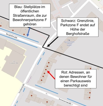 Hierzu kann mitgeteilt werden, dass diese Adressen im Status Quo in der Tat nicht für einen Bewohnerparkausweis in Parkzone F berechtigt sind, wie sich an folgendem Detailausschnitt aus dem bisherigen Parkzonenplan verdeutlichen lässt: