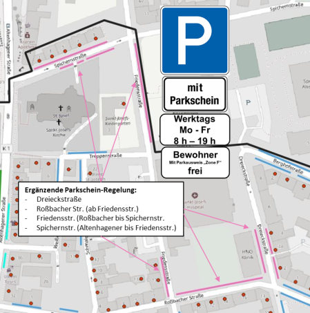 Der Rat der Stadt Hagen beschließt für die Straßen im direkten Umfeld des St.-Josef-Hospitals (Dreieckstraße, Roßbacher Straße von Friedensstraße bis Dreieckstraße, Friedensstraße von Roßbacher bis Spichernstraße, Spichernstraße von Altenhagener bis Friedensstraße) eine ergänzende Parkschein-Regelung. Verkehrsteilnehmende mit Bewohnerparkausweis können die Parkstände weiterhin ohne Einschränkungen nutzen. Die Verwaltung wird beauftragt auf dieser Basis die Installation von Parkscheinautomaten zu planen und eine entsprechend geänderte Beschilderung umzusetzen.