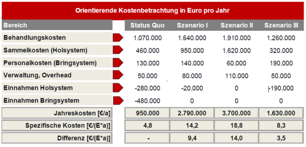 Im Ergebnis führen alle alternativen Szenarien zum derzeitigen Modell zu höheren Kosten in der Abfallentsorgung und damit auch zu höheren Gebühren. Diese bewegen sich pro Person und Jahr zwischen 3,5 € und 14,0 €, so dass ein Vier-Personen-Haushalt mit einer Mehrbelastung von ca. 14 € bis 56 € rechnen müsste.