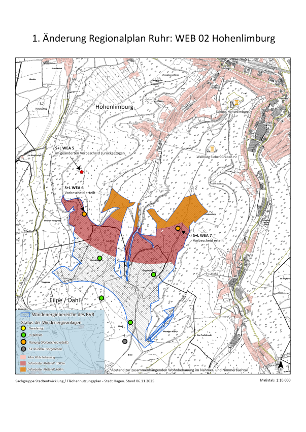 Besonders hervorgehoben wurden in dieser Stellungnahme die Konflikte im Bereich WEB 02 Hohenlimburg, bei der die von der Regionalplanungsbehörde festgelegten Abstände von 440 Metern zu bestehenden, zusammenhängenden Wohngebieten im Nahmer‑ und Wesselbachtal als zu gering betrachtet werden. Darüber hinaus äußerte Hagen erhebliche Bedenken gegenüber den Auswirkungen zusätzlicher Anlagen auf das Landschaftsbild, die Sichtbeziehungen zum Schloss Hohenlimburg und der Wallburg Sieben Gräben sowie auf die Wohn‑ und Umweltqualität der betroffenen Talräume.