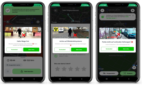 Zudem hat Lime sicherzustellen das die E-Tretroller nur im öffentlichen Raum und in den obligatorischen Parkzonen nur auf den ausgewiesenen Abstellflächen abgestellt werden. Darüber hinaus sind die E-Tretroller stets so aufzustellen, dass keine anderen Verkehrsteilnehmer (insbesondere Fußgänger, Radfahrer und Personen mit Mobilitätseinschränkungen) behindert werden. Lime gewährleistet, dass zuwiderhandelnde Personen ordnungsrechtlich verfolgt werden können.