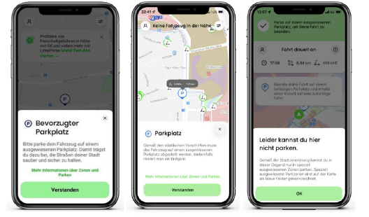 Um einen stadtbildverträglichen Betrieb des E-Tretroller Verleihsystems zu gewährleisten verpflichtet sich Lime dazu die Abstellflächen, die obligatorischen Parkzonen und Parkverbotszonen durch die Einrichtung einer virtuellen Grenze (Geofencing) zu kennzeichnen.