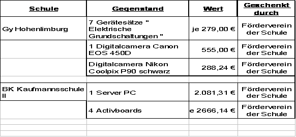 Schulen die in der Tabelle angeführten Gegenstände geschenkt wurden.
