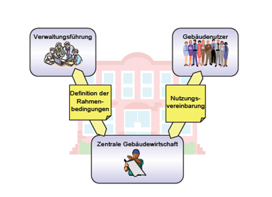 Zurzeit wird im Fachbereich Immobilien, Wohnen und Sonderprojekte (FB 23) die Hausherren- und Auftraggeberfunktion für den überwiegenden Teil[1] der städtischen Immobilien wahrgenommen. Die Immobilienkosten werden im Wesentlichen über Sammelbudgets verwaltet. Eine Zuordnung der Kosten auf einzelne Objekte ist zwar weitgehend möglich, jedoch haben die jeweiligen Nutzer keinen direkten Einfluss auf die Bewirtschaftungskosten und keinen wirtschaftliche Anreiz zur Kostenverringerung. Schnittstellen bestehen zwischen Immobiliennutzern, den Hausherrenämtern bzw. dem Fachbereich 23 und der GWH. Innerhalb der GWH kann es nach betroffenen Fachlichkeiten zu weiteren Schnittstellen kommen. Die Bewirtschaftung der Immobilien ist bisher aufgeteilt in