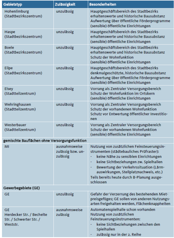 · Zukünftig sollen Spielhallen, Wettbüros und Vergnügungsstätten des Erotikbereiches nur noch in wenigen Stadtbereichen ausnahmsweise zulässig sein. Dies betrifft Teilbereiche der Innenstadt sowie das Gewerbegebiet um die Herdecker Straße / Bechelte Straße / Schwerter Straße im Bezirk Nord.