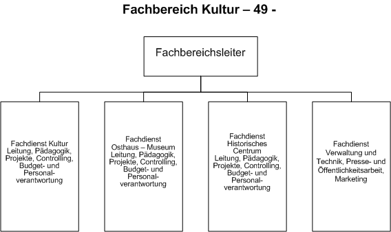 Zum 01.07.2012 wird der Fachbereich Kultur mit der Organisationskennziffer 49 gegründet und dem Vorstandsbereich 4 zugeordnet. Der Zuschnitt der Vorstandsbereiche wird durch diese Maßnahme nicht verändert, da die betroffenen Organisationseinheiten
