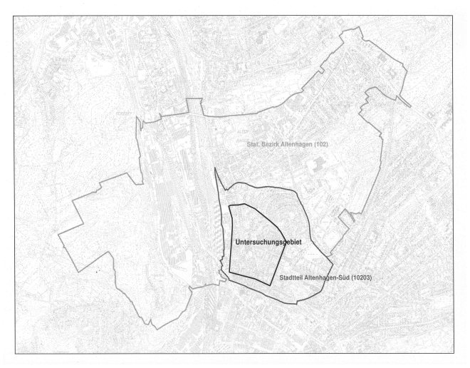 Räumliche Bezugsgröße für relevante statistische Daten sind der statistische Bezirk Altenhagen (102) und der Stadtteil Altenhagen-Süd (10203) (Abb.). Für das engere Untersuchungsgebiet liegen keine eigenen statistischen Daten vor, hier müssen also aus den vorhandenen Daten der größeren räumlichen Einheiten Analogieschlüsse gezogen werden.