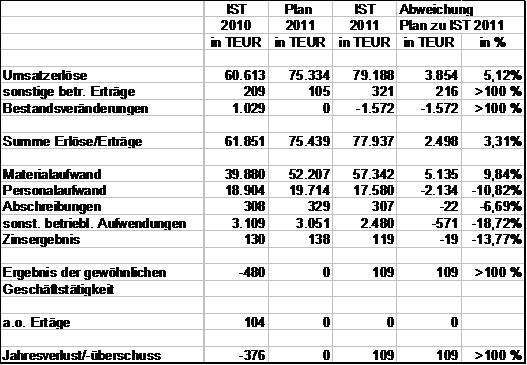 Im Vergleich zum Wirtschaftsplan 2011 ergeben sich folgenden Abweichungen: