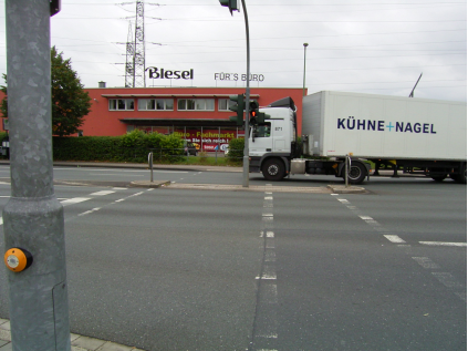 Es handelt sich um zwei hintereinander liegende Fußgängerampeln, die nicht beide bei normaler Gehgeschwindigkeit in einem Zug überquert werden können. Es muss daher auf der Mittelinsel gewartet werden, bis die zweite Ampel in Gehrichtung Blesel wieder Grün wird, da diese zwischenzeitlich auf Rot geschaltet hat. Die hier vorliegende Mittelinsel ist aber so schmal, dass Passanten, die einen Rollator oder Kinderwagen mit sich führen, in normaler Gebrauchsrichtung hintereinander nicht auf die Insel passen. Auch für motorbetriebene Rollstühle und Passanten mit mitgeführten Kleinkindern oder Haustieren ergibt sich eine als außerordentlich bedrohlich zu empfindende Situation, da die hier ständig verkehrenden Groß-LKW dem wartenden Passanten aufgrund der vorliegenden Enge fast über die Zehen fahren. Ein verunsichertes Kleinkind oder auch Haustier, das hier Panik bekommt und sich losreißt, könnte augenblicklich einen schweren Unfall mit vermutlich tödlichem Ausgang herbeiführen.