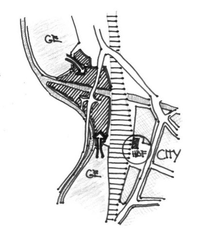 Mit dieser Variante wird versucht, zwischen der Innenstadt und den Brachflächen hinter dem Hauptbahnhof eine städtebauliche Verbindung herzustellen mit dem Ziel, den Hauptbahnhof als die Keimzelle bzw. das Zentrum eines neu zu entwickelnden zentralen Dienstleistungsquartiers zu kreieren: als einen Sprung über die Bahn zum Fluss.