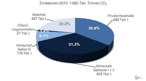 In Abbildung 1 zeigt sich, dass vor allem die privaten Haushalte, die Wirtschaftssektoren I und II sowie der Mobilitätsbereich einen großen Beitrag zu den CO2-Emissionen der Gesamtstadt leisten. Die öffentlichen Liegenschaften sind jedoch auf Grund der Bedeutung im Hinblick auf ihre Vorbildwirkung bei der Durchführung von Energieeinspar- und -effizienzmaßnahmen nicht zu unterschätzen.
