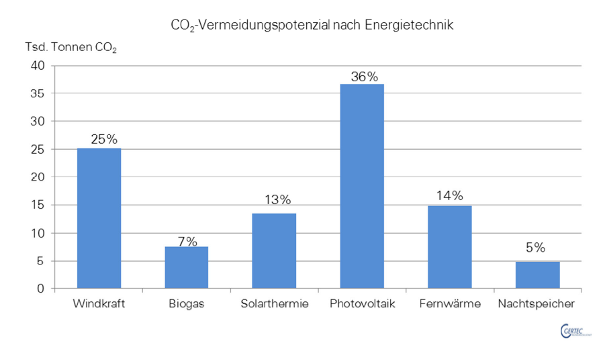 Die größten Potentiale liegen im Bereich des Ausbaus von Photovoltaik-Anlagen und dem der Windkraft. Weitere CO2-Einsparpotentiale können im Bereich der Solarthermie sowie dem Ausbau der Biogasnutzung und der Effizienzsteigerung der Fernwärme erschlossen werden.