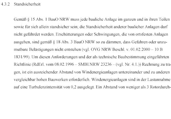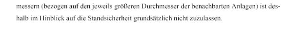 Jedoch ergibt sich aus dem nachfolgenden auszugsweise wiedergegebenem Windenergieerlass, dass aus Gründen der Standsicherheit ein Abstand der Anlagen untereinander von weniger als dem dreifachen Rotordurchmesser nicht zuzulassen ist.