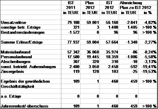 Im Vergleich zum Wirtschaftsplan 2012 ergeben sich folgenden Abweichungen: