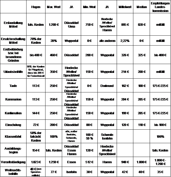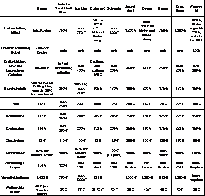 Die nachfolgende Tabelle 1 vergleicht die Hagener Beihilfen für Pflegekinder mit den Beihilfen der umliegenden Kommunen.