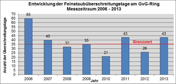 Der aktuelle Messbericht des Landes für den Zeitraum 01.01. – 31.12.2013 wurde Mitte Mai d.J. veröffentlicht und ist als Anlage beigefügt (siehe Anlage). Die Messergebnisse für Hagen zeigen, dass der Jahresmittel-Grenzwert für Feinstaub am GvG-Ring eingehalten wurde. Dagegen wurde der Feinstaub-Tagesgrenzwert von 50 µg/m³ (bei erlaubten 35 Überschreitungstagen im Jahr) an 43 Tagen überschritten (siehe Abb. 1).