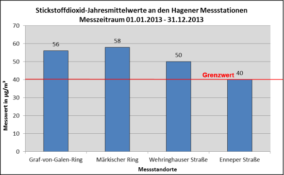 Ebenso wurde der Stickstoffdioxid-Grenzwert von 40 µg/m³ an den Messstationen GvG-Ring, Märkischer Ring und Wehringhauser Straße zum Teil sehr deutlich überschritten. Lediglich im Bereich der Enneper Straße wurde der Stickstoffdioxid-Grenzwert mit exakt 40 µg/m³ knapp eingehalten (siehe Abb. 2).