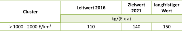 Im Hinblick auf eine Intensivierung der Abschöpfung der noch vorhandenen Potenziale, insbesondere bei den Nahrungs- und Küchenabfällen, werden Leit- und Zielwerte für Bio- und Grünabfälle auf Ebene der kreisfreien Städte und Kreise definiert. Diese sollen vor allem den Kommunen, die bisher geringere Mengen erfassen, als Maßstab für die anzustrebende Steigerung dienen und sie zu intensivierenden Maßnahmen motivieren. Dabei wird davon ausgegangen, dass eine Erfassung auch von Nahrungs- und Küchenabfällen erfolgt. Die Verteilung der Mengen auf die verschiedenen Systeme, wie die Biotonne und die Systeme zur getrennten Grünabfallerfassung, bleibt den Kommunen überlassen.