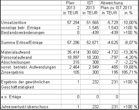 Im Vergleich zum Wirtschaftsplan 2013 ergeben sich folgenden Abweichungen: