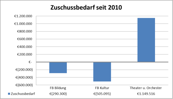 Hierbei ist zu berücksichtigen, dass beim Zuschussbedarf sämtliche Erträge und Aufwendungen erfasst werden. Dies umfasst auch Beträge, die nur mittelbar durch die Fachbereiche beeinflussbar sind (Personalkosten, Gebäudekosten etc.) bzw. bei denen die Fachbereiche vertragliche Bindungen eingegangen sind. Im Fachbereich Kultur gehören hierzu u.a. die Zuschüsse für die Kulturzentren (247.115 €), die Schloss Hohenlimburg gGmbH (10.000 €) sowie das ESM (38.000 €).