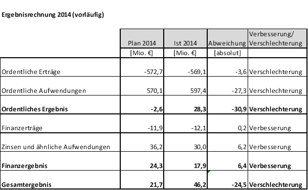 Unter Berücksichtigung des Finanzergebnisses (Verbesserung von 6,4 Mio. €) ergibt sich eine Verschlechterung des Jahresergebnisses um -24,5 Mio. € von 21,7 Mio. € auf 46,2 Mio. €. Allein die Gewerbesteuerentwicklung (Saldo -23 Mio. €) sowie die Verschlechterungen im Personal– und Versorgungsbereich (-14 Mio. €), die insbesondere auf erhöhte Rückstellungsverpflichtungen zurückzuführen sind, wirkten sich mit insgesamt 37 Mio. € negativ auf das Ergebnis aus.