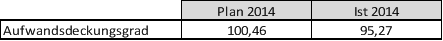 Auf Basis der Haushaltsplanung 2014 decken die ordentlichen Erträge 100,46 % der ordentlichen Aufwendungen. Auf Basis des vorl. Rechnungsergebnisses 2014 verschlechtert sich die Kennzahl Aufwandsdeckungsgrad auf 95,27 %.