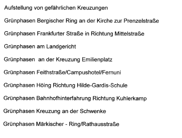 Die folgende Liste von signalgeregelten Kreuzungen und Einmündungen wurde vom Seniorenbeirat als „kritische Kreuzungen“ aufgestellt: