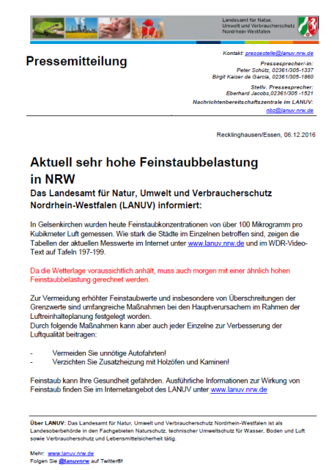 So wurde z.B. am 06.12.2016 die Meldung des LANUV im internen Email-Austausch kommuniziert, und es wurde die Pressestelle gebeten, aufgrund der Aktualität die folgende Pressemeldung des Landesamtes für Natur, Umwelt und Verbraucherschutz (LANUV NRW) auf die aktuellen Seiten ins Internet zu stellen (siehe Anlagen):