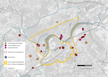 Um die Bedenken auszuräumen und eine Verzerrung durch ein erhöhtes Nachfragepotenzial zu vermeiden, wurde durch die cima für die Bewertung der Umsatzumverteilungen im Sortiment Drogerie- und Parfümwaren eine Anpassung dahingehend vorgenommen, dass die Anteile der Umsätze der Apotheken nicht berücksichtigt wurden. Im Zuge dieser Anpassungen wurden auch die Umverteilungseffekte auf die benachbarten Zentren neu bewertet. Die Ergebnisse verdeutlichen, dass keine der schützenswerten Zentren im Einzugsgebiet im abwägungsrelevanten Umfang von dem Planvorhaben betroffen sein werden.