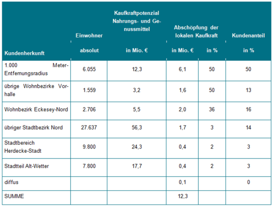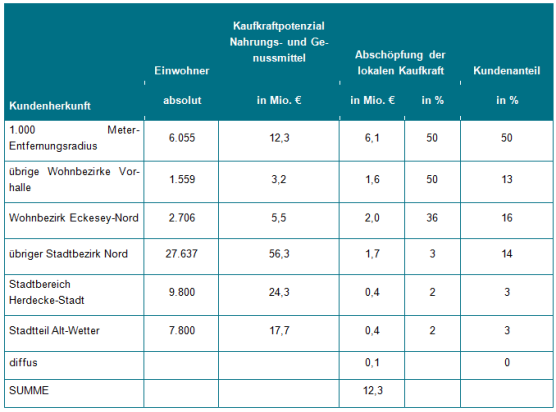Unter Berücksichtigung der Vorgaben des Regionalen Einzelhandelskonzeptes (REHK) zur Prüfung von derartigen Planvorhaben (Tragfähigkeit) wird der erwartete Umsatz des Planvorhabens dem Nachfragevolumen im Versorgungsbereich gegenüber gestellt. Hierbei bleibt der Bestand in Anlehnung an die Ausführungen des LEP NRW unberücksichtigt. Wird der erwartete Umsatz des Planvorhabens von 12,3 Mio. € im Sortiment Nahrungs- und Genussmittel allein dem Nachfragevolumen in den Wohnbezirken Vorhalle-Nord und Vorhalle-Süd (ohne Berücksichtigung des Wohnbezirke Eckesey-Nord) von 15,5 Mio. € gegenübergestellt, ergibt sich ein Wert von 79. Er liegt damit bereits erheblich unter dem Wert von 100, der aus Sicht des REHK bei Planvorhaben mit zentrenrelevanten Kernsortimenten nicht überschritten werden soll. Insofern ist nicht davon auszugehen, dass der mit dem Vorhaben verbundene Umsatz die in dem relevanten Einzugsbereich vorhandene Kaufkraft übersteigt.