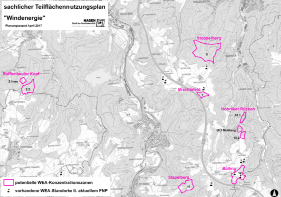 Die Vorranggebiete für Windenergie, die im Regionalplan Ruhr (RVR) voraussichtlich nächstes Jahr rechtskräftig werden, müssen in den FNP der Stadt Hagen übernommen werden. Die Stadt Hagen ist im Verfahren beteiligt worden und muss bis Februar 2019 eine Stellungnahme abgeben. Dazu wird die Verwaltung die Ratsgremien inkl. der Bezirksvertretungen beteiligen. Der geplante Standort einer WEA, die zur Zeit in einem Verfahren beim Verwaltungsgericht in Arnsberg geprüft wird, befindet sich in der östlichen Zone des Regionalplan-Entwurfs des RVR (in Hagen die Zone Stoppelberg)