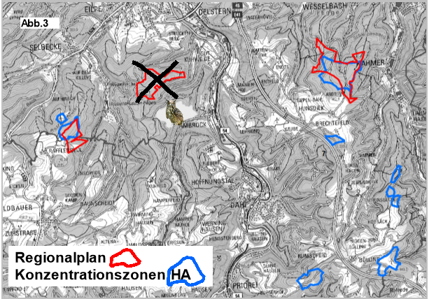 Der sich zur Zeit in Aufstellung befindliche neue Regionalplan des RVR stellt drei Vorrangzonen für Windenergie (rot in Abb. 3) im Stadtbezirk Eilpe/Dahl dar. Zwei kleinere Teilbereiche einer Vorrangzone reichen bis in den Stadtbezirk Hohenlimburg.