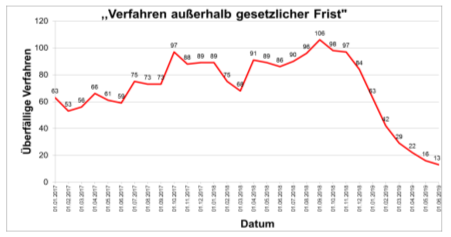 Die Zahl der ausstehenden Verfahren konnte innerhalb von rund sechs Monaten von 97 auf 13 Verfahren gesenkt werden (Stand 01. Juni 2019; vgl. Abbildung 1).
