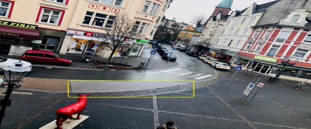Der gelb markierte Bereich wird sehr häufig von Fahrzeugen als Einfahrt zur Fußgängerzone, als Parkplatz für kurze Einkäufe oder zum Be- und Entladen genutzt. Hierdurch werden die Fußgänger in der Fußgängerzone sowie der Verkehr, insbesondere der Busverkehr im Hasper Kreisel sehr häufig eingeschränkt.