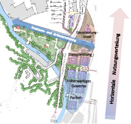 • Ansiedlung von Gewerbe und Dienstleistung (mit Hotelnutzung) mit hochwertiger Gestaltung,