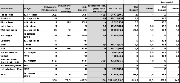 In Abstimmung mit den Trägern der Familienbegleitung, schlägt die Verwaltung die nachfolgend dargestellte Stundenausweitung für die einzelnen Sozialräume vor: