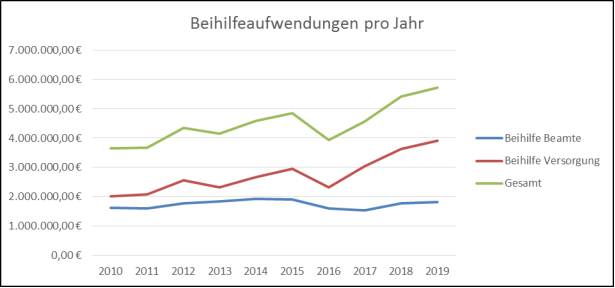Bis zum Jahr 2015 einschließlich waren im Beihilfeaufwand auch die Zahlungen an die Beihilfeberechtigten der verbundenen Unternehmen enthalten, die als Ertrag im Haushalt verbucht wurden. Seit dem Jahr 2016 erfolgt die Darstellung als Aufwandsminderung.