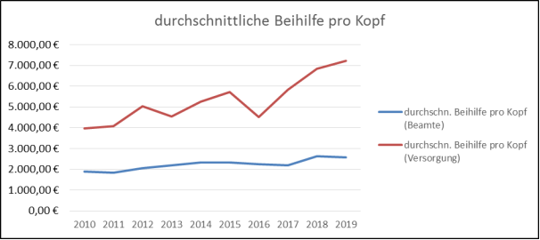 durchschn. Beihilfe pro Kopf (Versorgung) in € | 3.977 | 4.072 | 5.022 | 4.548 | 5.262 | 5.706 | 4.506 | 5.835 | 6.826 | 7.232 |