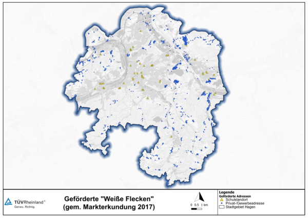 „Auch wenn die Bundesförderung zum Breitbandanschluss der meisten Hagener Schulen (55 Schulen einschl. Filialen) voraussichtlich bis Ende 2021 umgesetzt wird, verbleiben 17 Schulstandorte ohne den erforderlichen Anschluss an das schnelle Internet. Hier kann die NRW-Förderung nach der „Landesschulrichtlinie Glasfaser“ Abhilfe schaffen, um die dann vollständige Breitbandanbindung aller Hagener Schulen zu realisieren. Zusätzlich kann die Stadt Hagen über die Infrastrukturförderung des Landes, durch vorgezogene Modernisierung von 177 Lichtsignalanlagen, digitale Verkehrssteuerungssysteme wie z.B. Telemetrie, Luftreinhaltung, autonomes Fahren etc., umsetzen bzw. erstmalig die infrastrukturellen Voraussetzungen dafür schaffen. Das Bundesministerium für Verkehr und digitale Infrastruktur fördert den Breitbandausbau nicht nur von Haushalten und Gewerbebetrieben, sondern auch von Schulen und Bildungseinrichtungen im Rahmen des Bundesförderprogramms, kofinanziert durch das Land NRW. […] Hagen hat über den Breitbandkoordinator der Stadt entsprechende Anträge eingereicht; derzeit wird – vorbehaltlich der endgültigen Bewilligung durch den Fördergeber – davon ausgegangen, dass die sogenannten „weißen Flecken“ ab der zweiten Jahreshälfte 2020 sukzessive angeschlossen bzw. mit einem Breitbandanschluss versehen werden können. Diese Bundesfördermaßnahme soll, nach derzeitigem Planungsstand, bis Ende 2021 abgeschlossen sein.“ (Verwaltungsvorlage 1155/2019 im Schulausschuss vom 03.12.2019)