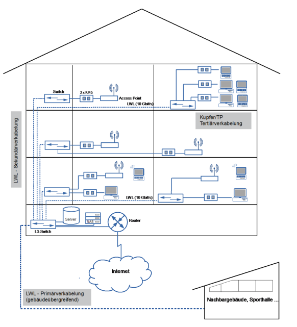 Näher betrachtet wird hier also die IT-Grundstruktur, bestehend aus strukturierter Verkabelung mit Haupt- und Nebenverteilern (Switches), sowie der primären und sekundären LWL- (Lichtwellen-Leiter) und der tertiären Kupferverkabelung (CAT-Kabel) bis zu den Endgeräteanschlüssen in den Unterrichts- oder Fachräumen, oder bis zu den WLAN-Access-Points (Siehe Abbildung 2).