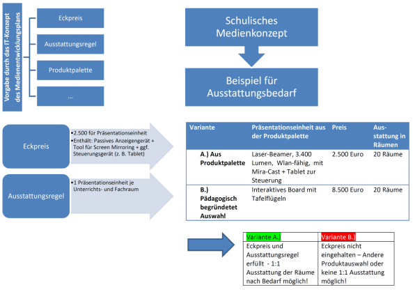 Transparente Regeln sollten bei der Ausstattung von Schulen definiert werden, sodass einerseits für eine hohe Kosteneffizienz gesorgt ist und andererseits die schulischen Akteure auf eine an schulische Bedürfnisse angepasste „Standardpalette“ zurückgreifen können. Dies dient der Orientierung. Es sollten bei zukünftigen Ausstattungen folgende Grundideen berücksichtigt werden: