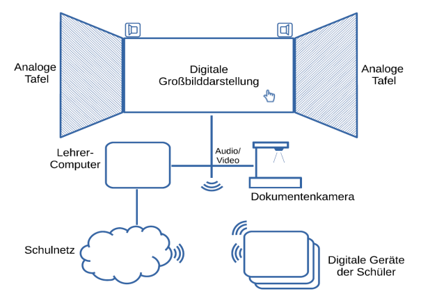 Klassische Kreidetafeln oder Whiteboards sollten, so der Beraterkreis zur IT-Ausstattung von Schulen in Bayern, nach wie vor Bestandteil von Unterrichtsräumen bleiben, damit eine Mischform aus dem Einsatz digitaler Medien und analoger Praxis möglich ist (siehe auch Abbildung 4).
