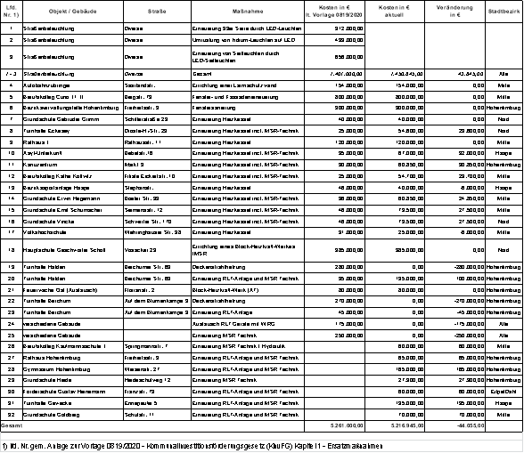 Die Maßnahmen Nr. 22 und 23 entfallen, da eine Umsetzung nicht bis zum Jahresende 2021 (Ende des Förderzeitraums) gewährleistet ist. Die Pauschalpositionen Nr. 24 und 25 wurden aufgelöst und in neue Maßnahmen mit laufender Nr. 26 - 32 konkretisiert.