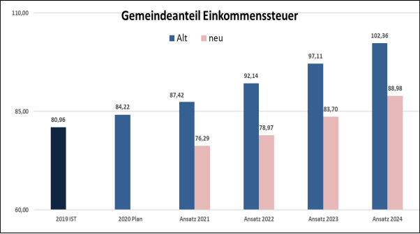 Zur Berechnung des Gemeindeanteils an der Einkommensteuer wurde der in den Orientierungsdaten 2021 bis 2024 vom 30.10.2020 für das Jahr 2020 genannte absolute Betrag auf Landesebene (8.261 Mio. €) mit den Orientierungsdaten gesteigert und dann mit der für die Jahre 2021 – 2023 geltenden neuen Schlüsselzahl multipliziert. Die Mindererträge gegenüber der ursprünglichen Haushaltsplanung 2020/2021 sind bedingt durch die Coronapandemie und werden daher als coronabedingter Schaden gewertet.