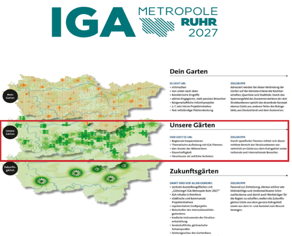 Die Internationalen Gartenausstellung (IGA) Metropole Ruhr 2027 ist in drei Ereignis-Ebenen organisiert und verknüpft so die vielfältigen und individuellen Orte unserer facettenreichen Region. Zur ersten Ebene zählen die drei Hauptstandorte „Rheinpark“ in Duisburg, „Zukunftsinsel Gelsenkirchen“ (Nordsternpark und Emscherinsel) und „Emscher Nordwärts“ in Dortmund. Der Besuch dieser Orte wird kostenpflichtig sein.
