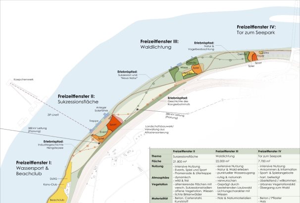 Das in einer Machbarkeitsstudie erarbeitete SeePark Konzept (siehe Anlage 3) setzt sich aus unterschiedlichen Sequenzen zusammen und sieht eine modulare Vorgehensweise bei der Entwicklung der Fläche vor. Aufgrund der Größe des ca. 20 ha großen Areals und der vielfältigen Ansprüche, die sich u. a. aus der aufwändigen Sanierung der Altlasten auf der Fläche ergeben, ist die Umsetzung eines hierfür speziell abgestimmten Maßnahmenkonzeptes bis zur IGA vorgesehen.