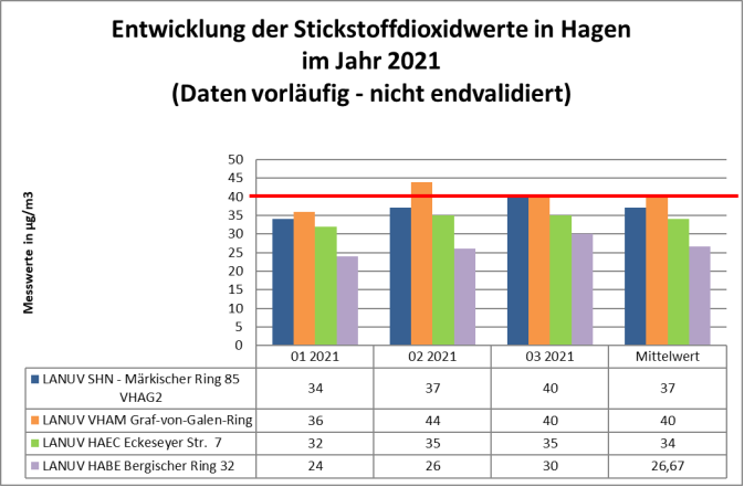 wird nach den zwischenzeitlich vorliegenden, endvalidierten Messdaten des Umweltministeriums für das Jahr 2020 an allen Messstellen in Hagen der Grenzwert für Stickstoffdioxid eingehalten. Damit wird erstmals seit Beginn der Immissionsmessungen in Hagen im Jahr 2004 der rechtsverbindliche Grenzwert für Stickstoffdixoid an allen Hagener Messstellen eingehalten. Das gilt auch für die neu hinzugekommen Messstationen „Bergischer Ring“ und „Eckeseyer Straße“ (s. Abb.1).